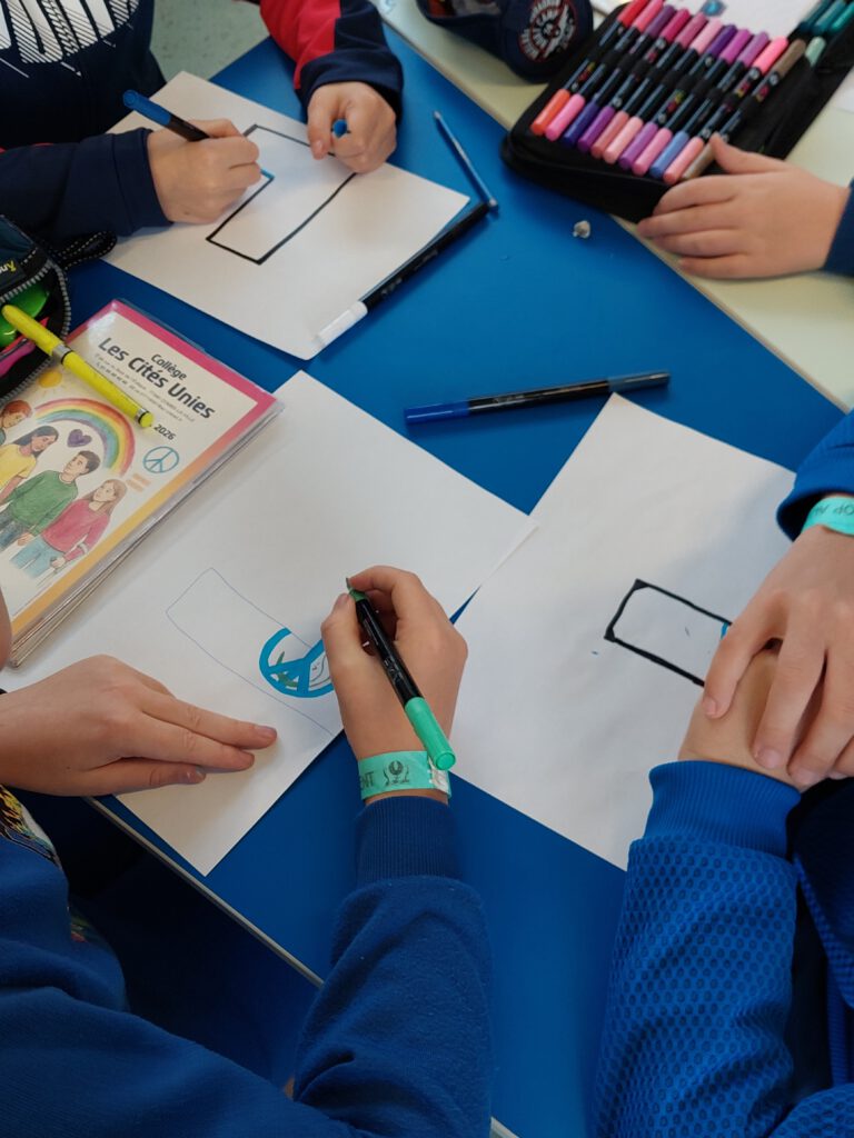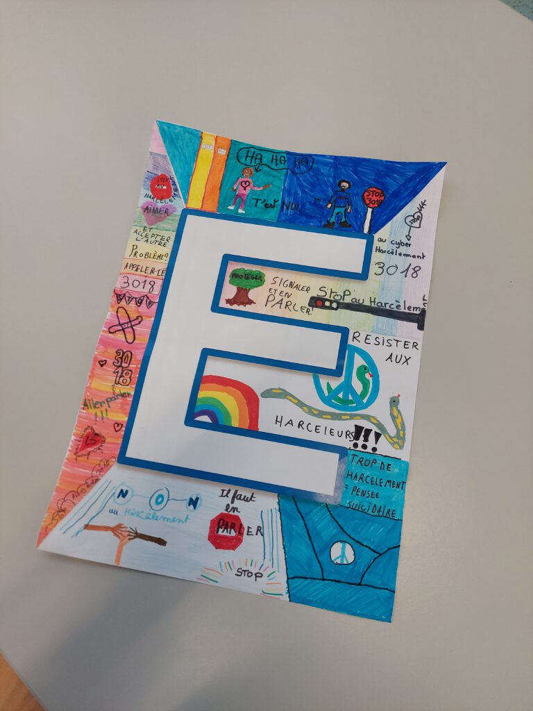 En deuxième heure de cours, chaque classe avait une lettre de la phrase “ENSEMBLE NON AU HARCÈLEMENT” . Chaque classe a colorié sa lettre. Toutes les lettres ont ensuite été affichées dans le hall à l’entrée du collège.