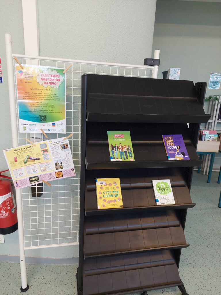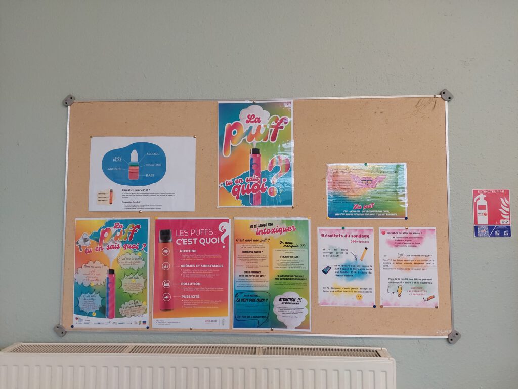 En novembre et décembre, Mme Dalmat, infirmière scolaire et Mme Varoux, professeure documentaliste ont organisé au CDI des temps d’animation autour de la puff, dans un but de prévention. Mme Dalmat était présente à plusieurs récréations pour répondre aux questions des élèves. Un sondage avait été réalisé quelques temps auparavant pour faire le point sur les connaissances des élèves sur la puff, ainsi que leur possible consommation.